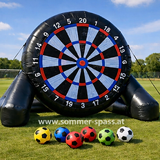XXL Fußball-Dart 🎯⚽ Mit der XXL Fußball-Dartscheibe wird jedes Event zum sportlichen Highlight. Statt Pfeilen werden Klett-Fußbälle auf eine riesige Dartwand geschossen. Wer trifft die meisten Punkte? Auf der zweiten Zielwand warten zusätzliche Ziellöcher auf treffsichere Spieler – Spaß und Wettbewerb garantiert. Dank des integrierten QuickRelease-Seilsystems können die Klettbälle schnell und einfach von der Dartscheibe gelöst werden – ganz ohne zusätzliches Zubehör. Die aufblasbare Dartwand steht stabil, ist wetterfest und aus robustem PVC gefertigt. Perfekt für Firmenfeiern, Sportfeste, Geburtstage, Vereinsfeste oder Promotion-Events – ein echter Publikumsmagnet für Kinder, Jugendliche und Erwachsene. Technische Daten Größe (L x B x H): 5,6 x 2,8 x 4,2 m Gewicht: 49 kg Packmaß: 0,80 × 0,60 × 0,60 m Nutzung & Aufbau Spieler: 1–4 Personen gleichzeitig Aufbauzeit: ca. 25 Minuten Sicherheitszertifikat: gemäß EN 14960.